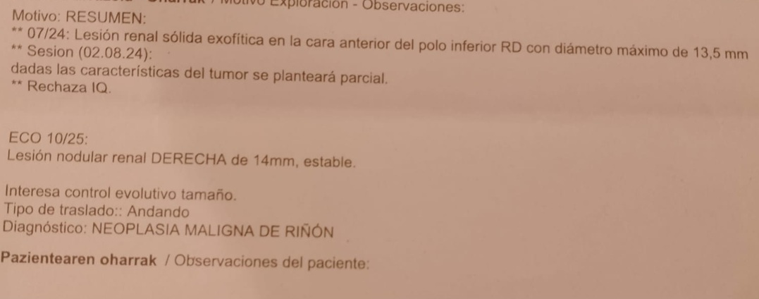 A fortuitous discovery of a 14mm nodular lesion in his right kidney. The doctors' diagnosis is Malignant Neoplasia of the Kidney.